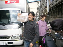 2/2、いよいよ三百人劇場にて搬入開始!搬入の貴重な助っ人として立ち会ってくれた元コーラス・シティ団員はつらつとした表情が見える。 |