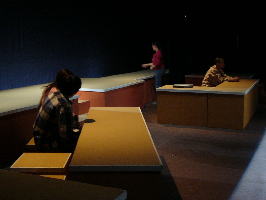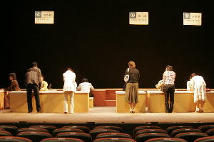いよいよ開場! なかに入って驚いた。もうステージで舞台が始まっている。なにやらお役所の受付のようだ。いろんなお客がやってきては話しかける。窓口は対応と電話に追われている。社会保険事務所の日常の風景がそこに現出する。 |