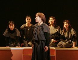 背に歌う亜矢子。迫力の戦闘シーンがこのあと展開された。 |
