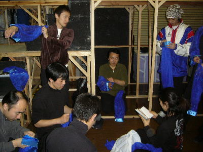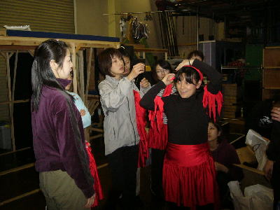 この日行われた衣装あわせ。女性陣は”赤”で統一。菊地明美が見本を見せて、これから各自で作成開始。 |