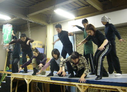 今回の舞台の特長である、抽象的な意味合いのアンサンブル。ストーリーに深い意味合いが注入される。 |