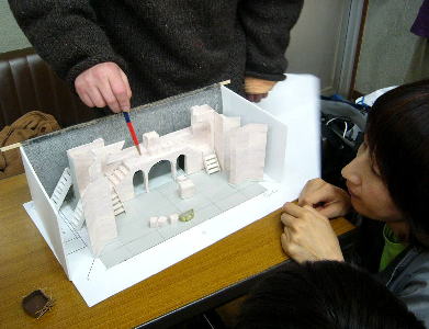 紙でこしらえた見事な”会場模型”。演出の木島さんが位置の説明。 |