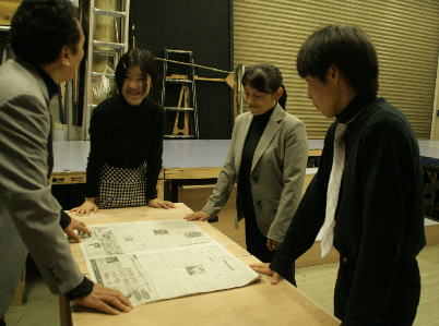テーブル会議のシーン。広げた新聞はこの日、某新聞に掲載されたTOmorrow公演の宣伝記事!! |
