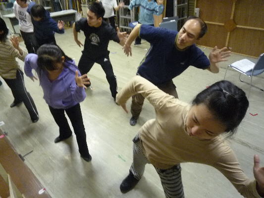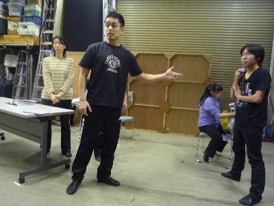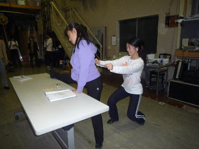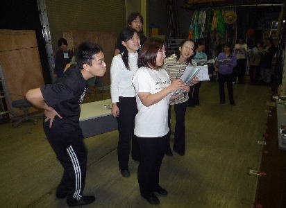 演技レッスン。センターに立つのは処女作を書いた脚本、主役の征矢朋子。興味深そうにのぞいているあっきー(左) あっきーは今回が初舞台!どんな演技をめせてくれるか、楽しみです。 |