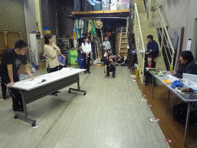いったん演技を中断。木島さんの話に聞き入る出演者。どういうニュアンスで動くか、話すか。舞台はみせものだけれど、リアリティが大切。なんどもなんども同じシーンをやりなおします。 |
