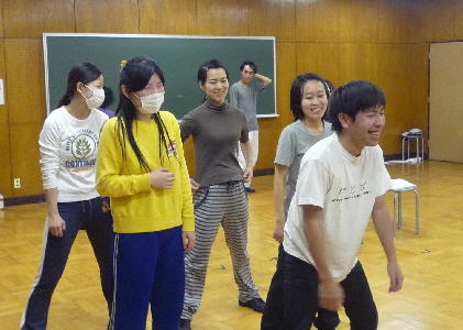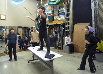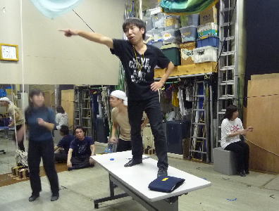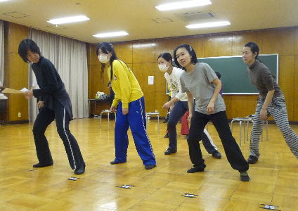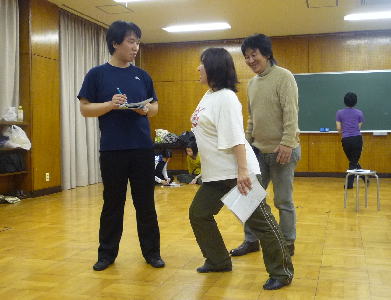 なんと演出の木島さんまでもが直々のダンス指導。形のポイントを伝えます。この日はなんと2、3日の入院から退院されたばかりという木島さん。まったく元気そのもの!! |
