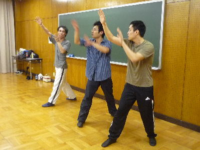 そんななか、稽古場後方では男性陣が「独自の闘い」を繰り広げる!!。まっつんをまんなかにこうくん、あっきーの三人。 あれ? 足違ってない?!! |
