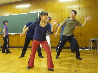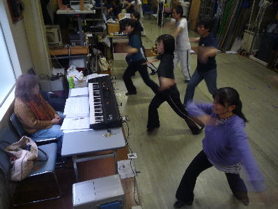 あれ!!歌唱指導なのにもうダンス!? いやいやこれも美音子先生のレッスン。ミュージカルですから、踊りながら歌うのですから、踊らないと歌レッスンにならないのです。踊りのなかに、歌のポイントが見えてくることもあるのです。 |
