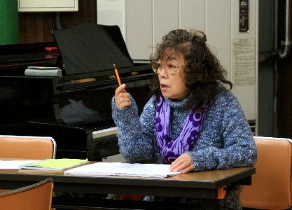 「タンゴ、ロック、それぞれリズムが違うけど、頭で知るのでなく、体にリズムをしみこませることが必要!それには何度も聴くこと‥」宝塚のトップもレッスンに来るという、山下美音子先生の歌唱指導。 |