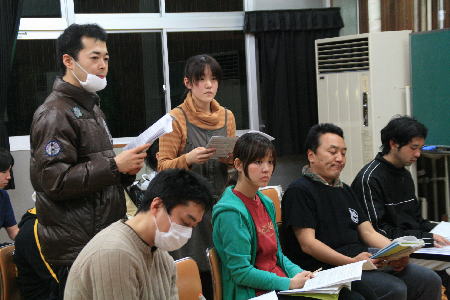 神妙な面持ちでレッスンを受けるメンバーたち。 |
