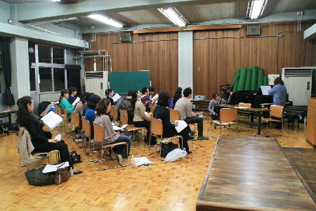 続いては歌唱レッスン。東京、四谷は三栄町生涯学習館ホールのピアノの周りに椅子を並べてスタンバイOK! |