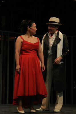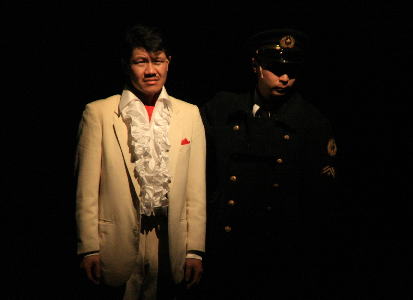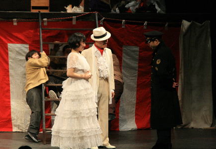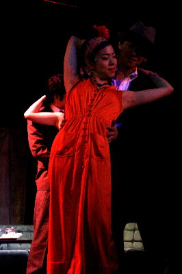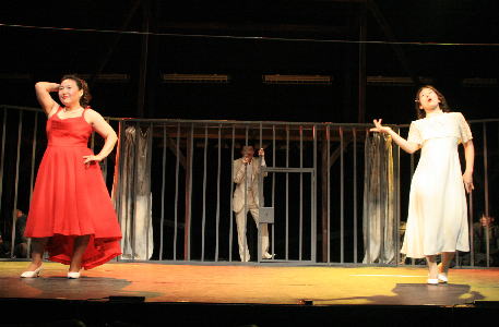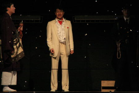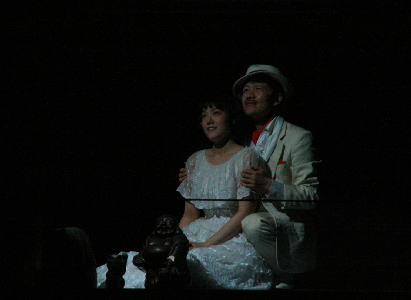 後半、有名なソロモンソング。たばこの火をかす進行係と、聡美役のひさゆきさん。 |