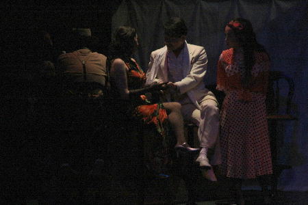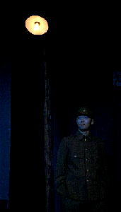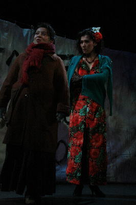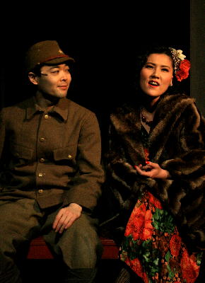 ソロを歌う芳恵役の菊地明美(左)。 街灯の下にたたずむ進行役のりょうた‥ |