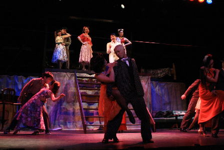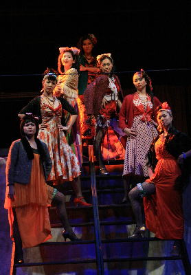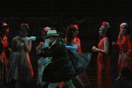 「人はなんのために生きるのか?」娼婦たちが階段上に立ち並んで歌う壮麗なシーン。 |