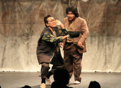 こじきの元締め、庄吉のもとにやってきたこじき見習い。熱演光るコミカルなシーン。 |