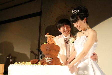 としとありさが入場!”最初の共同作業”ケーキ入刀。