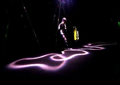 場面ごとに灯りを作っていく。光の帯が動く照明効果。 |