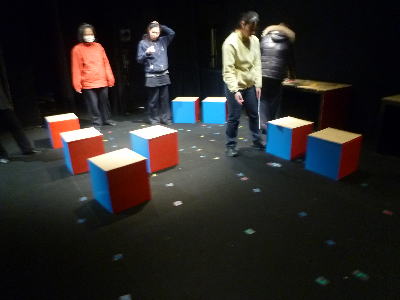 舞台面で準備する出演者たち。床に点々としているのはバミリのシール。