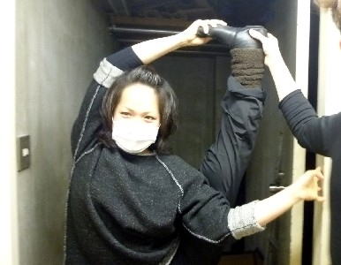 舞台面の設営。道具類を運ぶこんだら、まずはパンチカーペットを張りはじめる。 |
