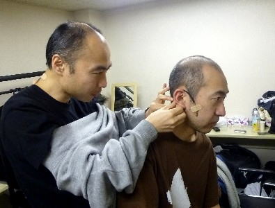 しげさん。ピンマイクのセットをする二人。 |