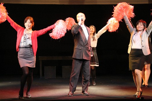 「明るく励ましあって笑顔が耐えない職場が私の理想」と歌う課長の岩清水。