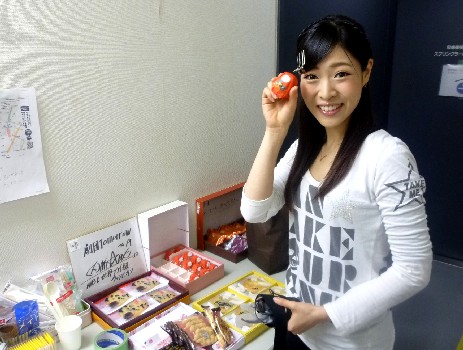あやが手にしているのは金沢から届いた銘菓のもなか。 |
