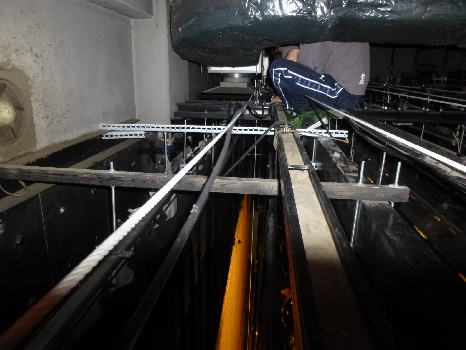 そのころステージ上ではパイプにロープをつるす仕事。高いところで長時間仕事をしていると