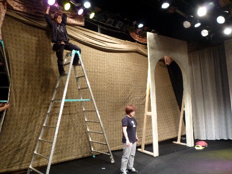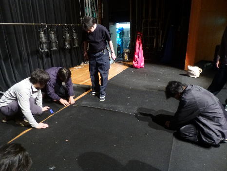 舞台面ができてたら照明さんによる照明シュート。体を張った仕事だ。 |
