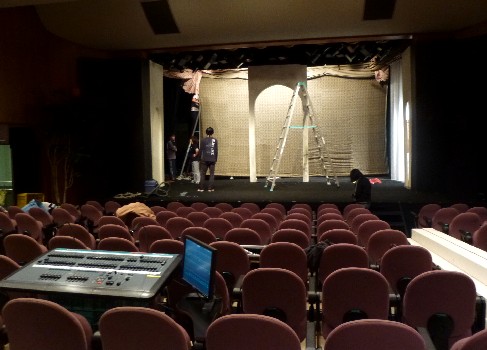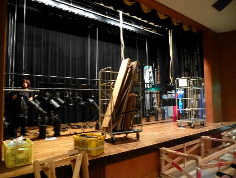音響さんのミキサー付近からの景色。舞台面がだいぶできてきた。 |