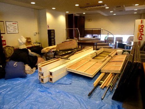 ロビーに大道具の資材が運び込まれる |