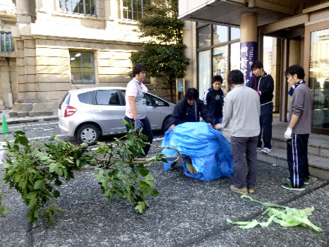 一番大変なのは大きな生木。根元の土の部分が重い。大の男6人で運び込む。 |
