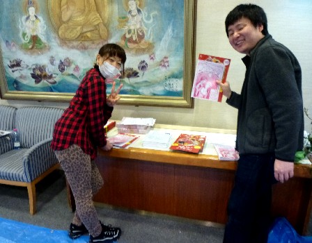 舞台面の作業のかたわら、ロビーではパンフレットの準備。
