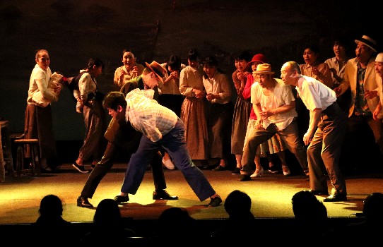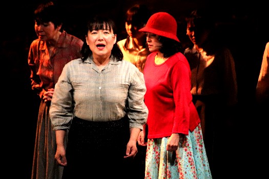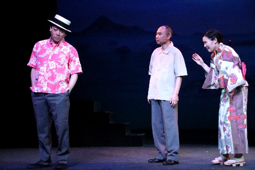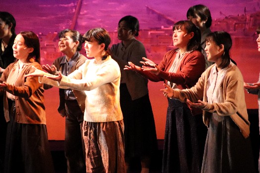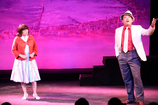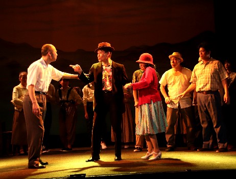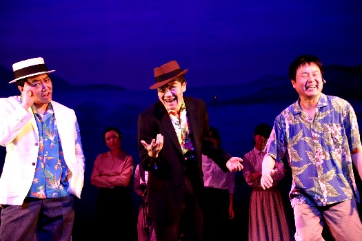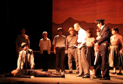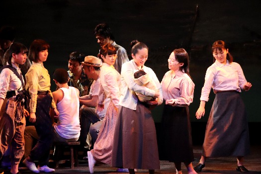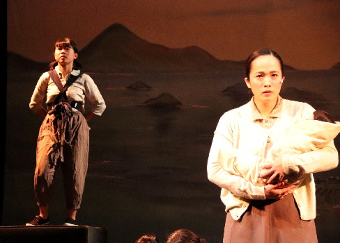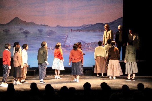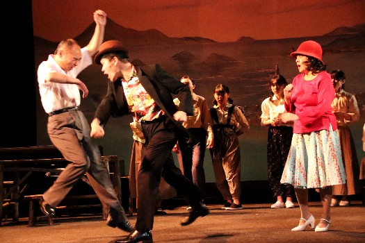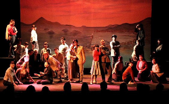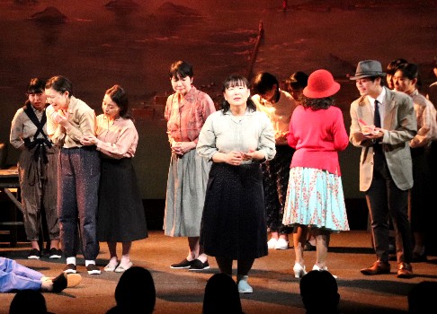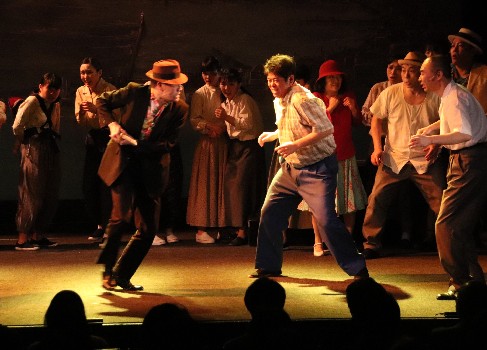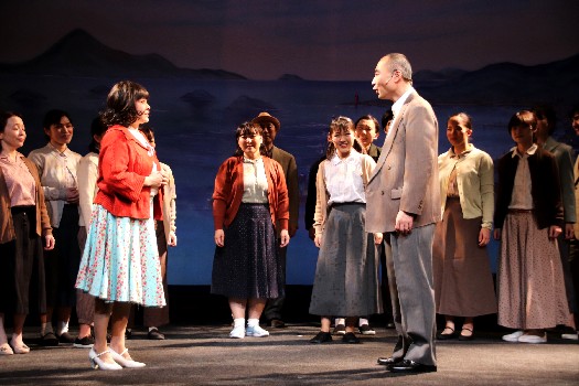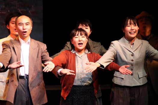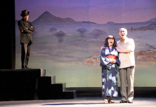 美智子と良雄の歌で一幕の幕切れ。背景には鋭次の姿が。 |