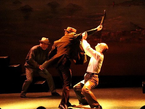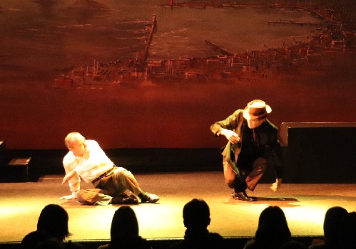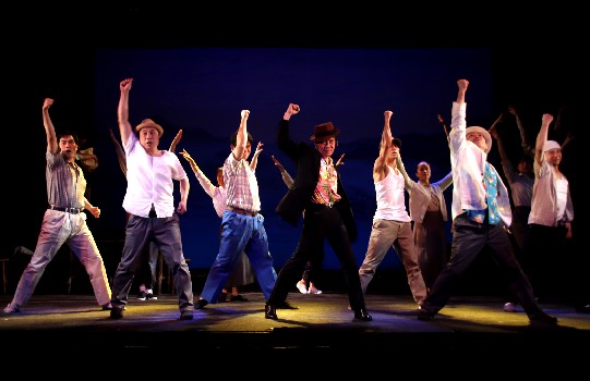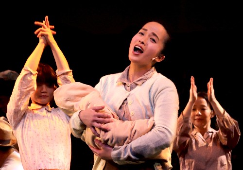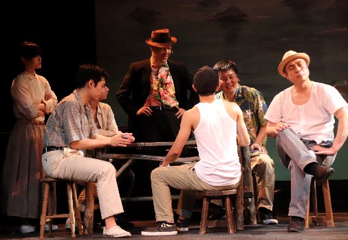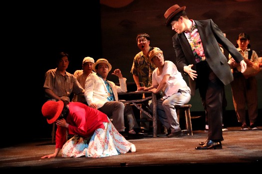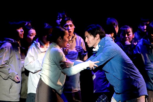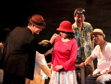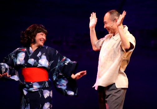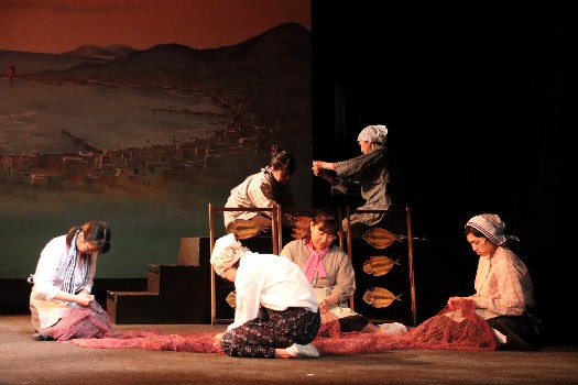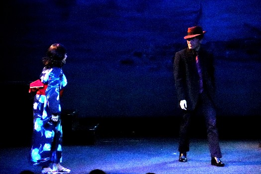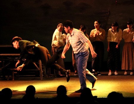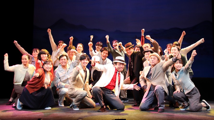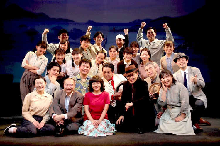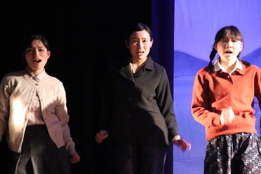 美智子と良雄の歌で一幕の幕切れ。背景には鋭次の姿が。 |