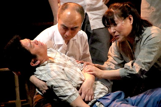 晃を抱きかかえる良雄。夫の死に嘆き悲しむ妻の幸子 |