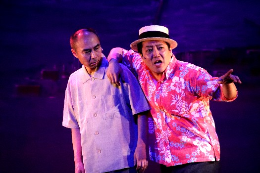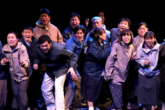 二幕冒頭、嵐のシーン。 「高波がきたら一発だ!」男たちが、もやい綱の緩みに気づく |