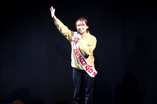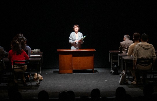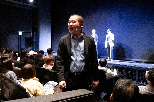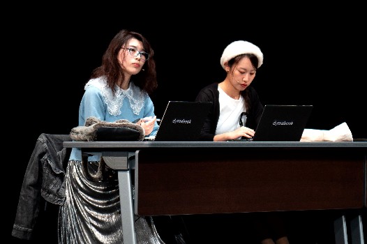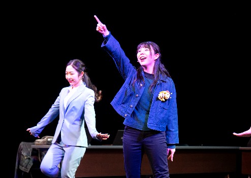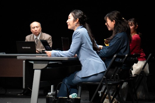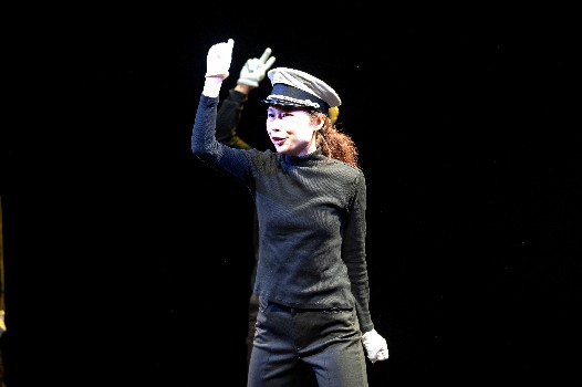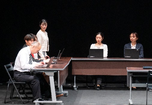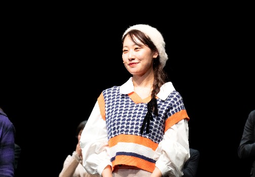 会場の案内係を務める宇津美淑恵役を演じる新人団員の佐藤実優。 |