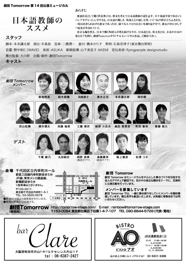 派遣社員として働く世良舞子は、将来を考えて、日本語教師の道を志す。早々学校に入学するも、日本語の難しさ、外国人との接し方等、いくつもの壁が立ちふさがる。いざ授業をしても思うようにならず悩む日々。一時はあきらめかけた彼女であったが、様々な人との出会いを繰り返す中で、彼女の中に少しずつ変化が生まれていく。 日本語とは、異文化とは、日本人とは何かを問う、劇団Tomorrowオリジナル作品。 劇団Tomorrow第14回公演にご期待下さい。